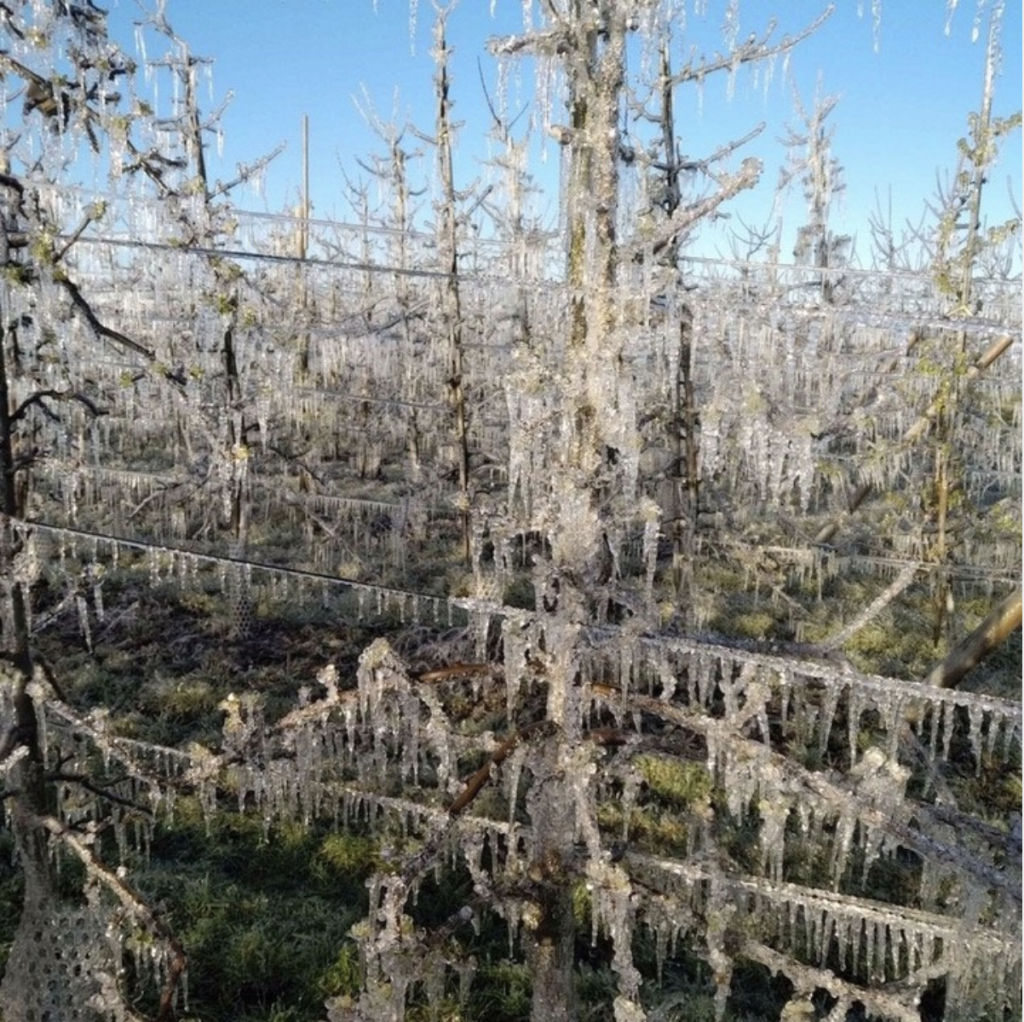 Système d’aspersion: Le principe est d’arroser les pommiers pour protéger les bourgeons et les fleurs en maintenant la température à 0°C. En se transformant en glace, l’eau liquide libère des calories qui sont récupérées par la végétation pour maintenir sa température à 0° !
